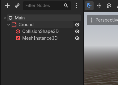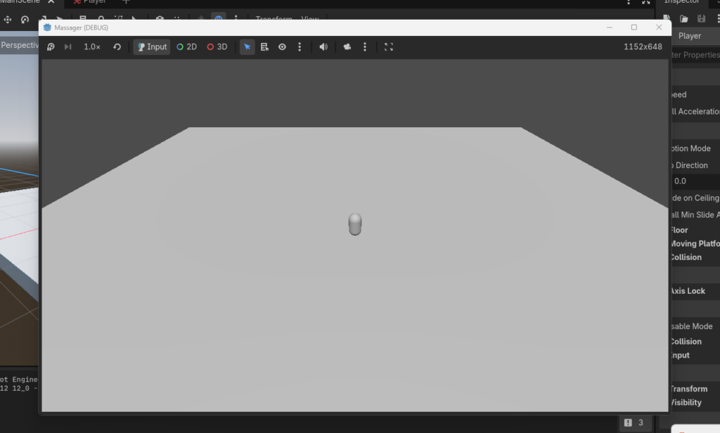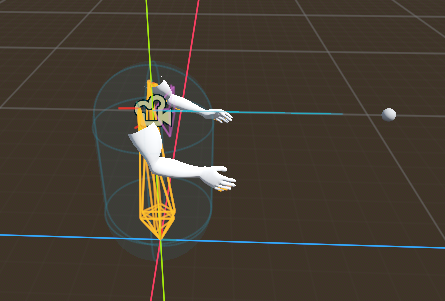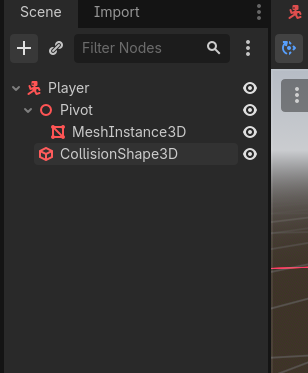 その下にNode3Dを追加して(Pivotと命名)、更にその下にキャラの3Dモデルを配置する(今回は単純なMeshInstance3Dを使った)