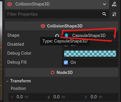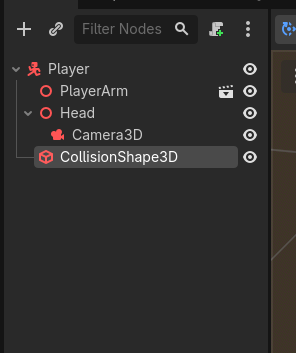 ルートのPlayerノードの子要素として(Pivotと同階層)CollisionShape3Dノードを配置する。