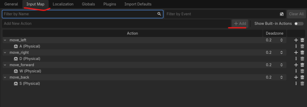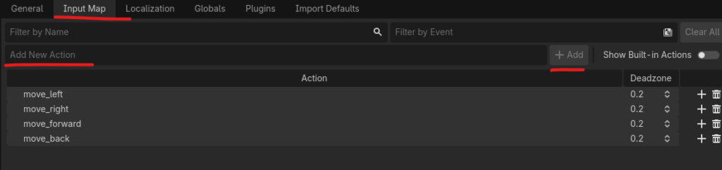 Godot上部タブのProject – Project Setting と進み、 input map タブを選択する 。