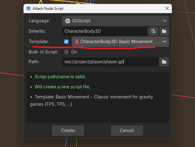 ルートのCharacterBody3Dを右クリックしてAttachScript
